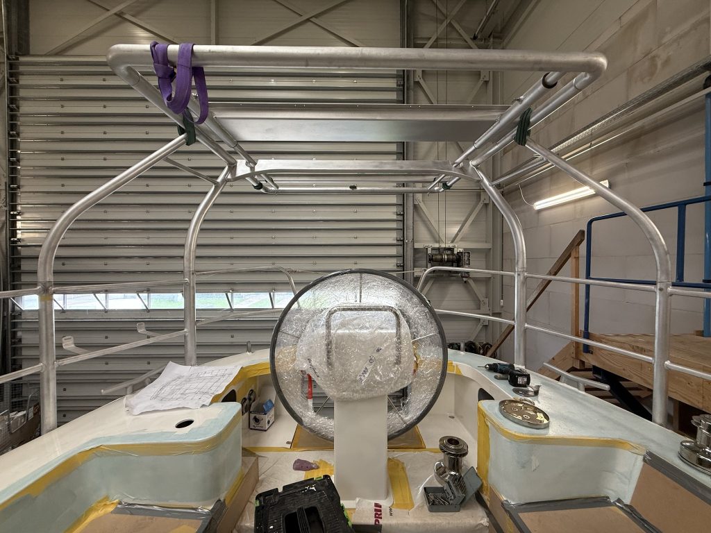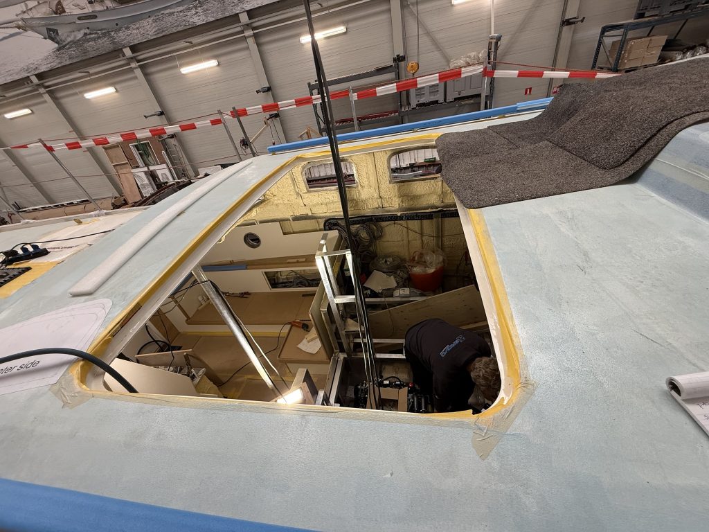 Things are moving forward on the Puffin 42. This Friday and Saturday, the deck will be placed, which is a major step in the build. Preparations for this have already been made: the winches are positioned, and the spacer rings will be loosely fitted before the weekend. The solar arch, made by SDH, has also been installed.
