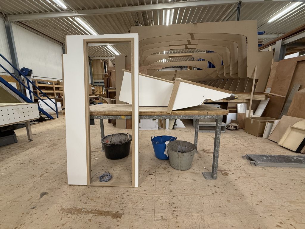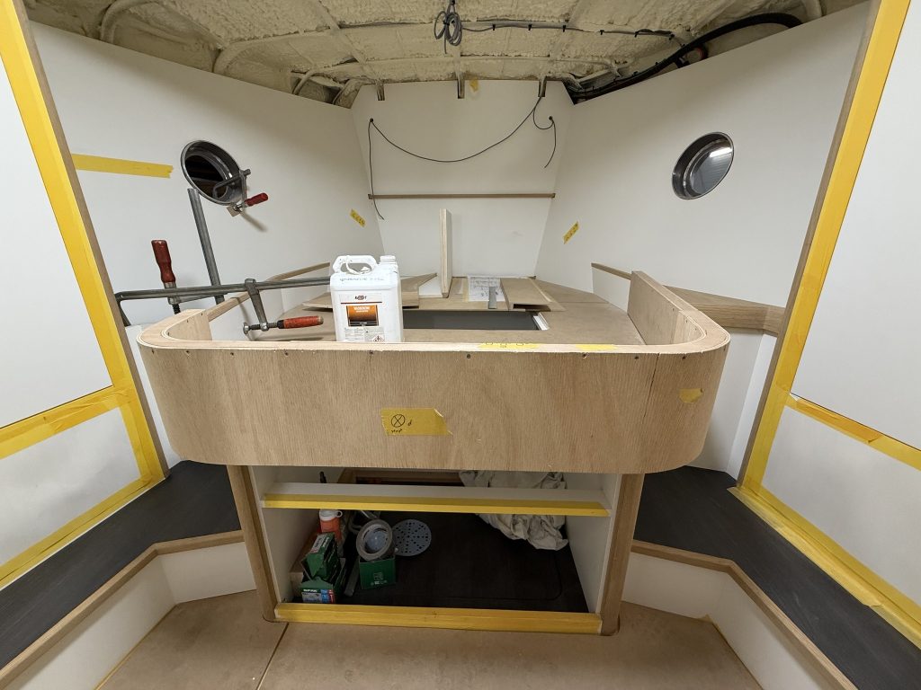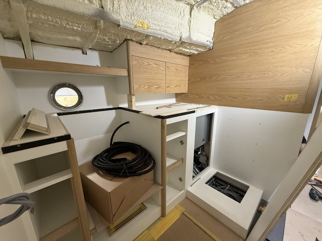 Inside, the yacht is also taking shape. The subfloor has been installed, and the saloon bench is now in place. The upper cabinets, guest cabin wardrobe and wall panels are all ready for installation.